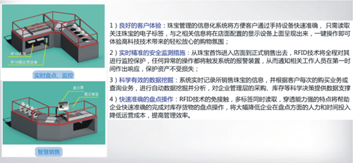 | 傳統(tǒng)零售 縱觀整個珠寶行業(yè)管理,大都存在著專賣點柜臺盤點的問題,但目前的珠寶盤點工作基本是通過人手工操作完成,而珠寶產(chǎn)品存在體積小,數(shù)量大的實際情況,大數(shù)量的產(chǎn)品由少量的營業(yè)人員進(jìn)行盤點,就造成了盤點工作費時巨大的實際情況,有數(shù)據(jù)顯示,一個普通的珠寶對店內(nèi)的產(chǎn)品進(jìn)行一次盤點工作,平均需要五個小時左右。盤點效率的問題導(dǎo)致了各個珠寶店無法做到對產(chǎn)品每日或者每周進(jìn)行盤點。同時,因為珠寶大都是高價值的產(chǎn)品,其各項指標(biāo)和參數(shù)既繁瑣又專業(yè),且人員較雜時容易丟失而導(dǎo)購員不能快速響應(yīng),在珠寶數(shù)量較多的柜臺,將對導(dǎo)購員的工作將造成很大壓力,容易造成貴重物品的失竊。這種完全依靠人的經(jīng)驗跟能力的管理銷售辦法很大程度上制約了企業(yè)的業(yè)務(wù)擴(kuò)展和客戶體驗感。 RFID技術(shù)原理簡介 通過射頻識別系統(tǒng)采集到的待識別物體的特征信息通常情況下先由中間軟件進(jìn)行處理,或直接將采集到的識別信息通過計算機(jī)信息處理技術(shù)(如數(shù)據(jù)庫技術(shù)等)及計算機(jī)網(wǎng)絡(luò)技術(shù)(Intranet & Internet技術(shù))實現(xiàn)信息的融合、共享、遠(yuǎn)距離傳送等直接服務(wù)于有關(guān)的業(yè)務(wù)應(yīng)用系統(tǒng)。 設(shè)計思路 為貴重的珠寶商品貼上RFID標(biāo)簽,利用自動識別設(shè)備監(jiān)測、控制和跟蹤貼標(biāo)的珠寶首飾,實現(xiàn)快速盤點、實時跟蹤及銷售管理智能。從而對珠寶產(chǎn)品的進(jìn)出和銷售過程進(jìn)行全方位的跟蹤和記錄,用自動化和準(zhǔn)確高效地新方法取代了繁瑣和低效的人工管理和條碼掃描模式。 安全監(jiān)測系統(tǒng)與盤點 安全狀況下,RFID讀寫器通過天線,能讀取到柜臺上的每一個珠寶電子標(biāo)簽信息,一旦有意外情況,讀寫器一定時間內(nèi)讀取不到某標(biāo)簽的信了,將會通過系統(tǒng)報警設(shè)備給予工作人員告警。 智能銷售系統(tǒng) 在柜臺附近部署LED顯示屏,當(dāng)向客戶展示該珠寶時,系統(tǒng)屏幕上隨即展示該珠寶的相關(guān)明細(xì)屬性“款式、產(chǎn)地、設(shè)計師、重量、材質(zhì)、純度、等級”等,提升了珠寶品牌的公信力、品牌形象,有利于銷售人員能夠抽出更多精力來提供更好的增值服務(wù),提升客戶體驗,促進(jìn)銷售。 快速結(jié)算 珠寶商品在客戶選購?fù)瓿蛇M(jìn)行結(jié)算時,工作人員將珠寶標(biāo)簽在收銀臺配置的一體化讀寫器上識別完成結(jié)算,結(jié)算臺計算機(jī)將顯示與該商品相關(guān)的信息,同時提示客戶消費金額,在完成交易后,工作人員在計算機(jī)上確認(rèn)完成銷售,中心服務(wù)器將該商品在數(shù)據(jù)庫中標(biāo)記為已售出,同時,柜臺RFID設(shè)備將不再保持對該設(shè)備的監(jiān)測。 |
